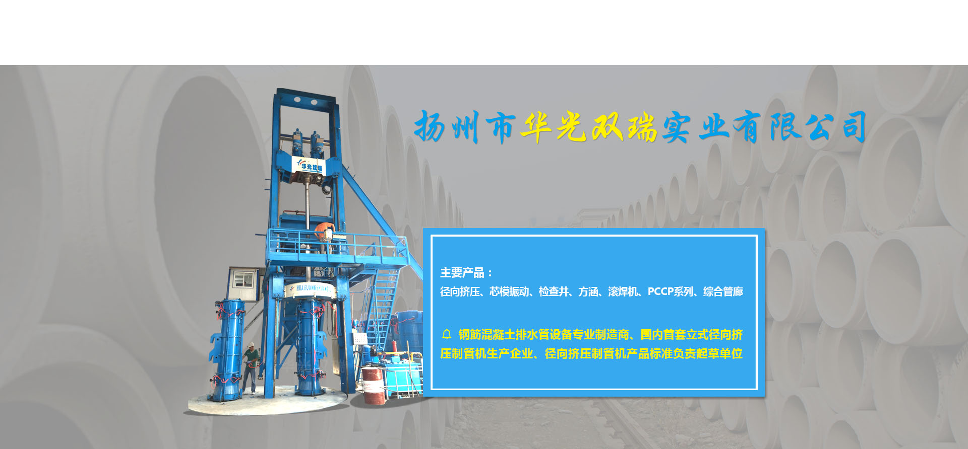 ????????揚(yáng)州市華光雙瑞實(shí)業(yè)有限公司,位于中國歷史文化名城揚(yáng)州市東郊江都區(qū)丁伙工業(yè)園區(qū),公司成立于2000年10月,是一家專門致力于鋼筋混凝土排水管生產(chǎn)裝備的設(shè)計開發(fā)、加工制造、銷售服務(wù)的專業(yè)制造商。公司2016年度被授予全國建材機(jī)械產(chǎn)品定點(diǎn)生產(chǎn)企業(yè),2017年度被授予中國混凝土與水泥制品協(xié)會會員單位,江蘇省認(rèn)定企業(yè)技術(shù)中心,江蘇省研究生工作站,揚(yáng)州市水泥制品工程技術(shù)研究中心,先后承擔(dān)過國家火炬計劃項(xiàng)目一項(xiàng),省科技項(xiàng)目二項(xiàng),揚(yáng)州市重點(diǎn)研發(fā)項(xiàng)目一項(xiàng)。公司擁有自主知識產(chǎn)權(quán)36項(xiàng)(發(fā)明專利6項(xiàng),實(shí)用新型專利30項(xiàng)),公司研發(fā)的13種產(chǎn)品榮獲江蘇省高新技術(shù)產(chǎn)品稱號。公司產(chǎn)品有立式徑向擠壓制管機(jī)系列、芯模振動制管機(jī)系列、檢查井系列、方涵系列、自動變徑滾焊機(jī)系列、PCCP系列、綜合管廊系列。核心產(chǎn)品立式徑向擠壓機(jī)2014年度榮獲混凝土與水泥制品行業(yè)技術(shù)革新一等獎,2015年度獲江蘇省機(jī)械工業(yè)科技進(jìn)步二等獎,2016年度獲全國建材行業(yè)技術(shù)革新一等獎,預(yù)制混凝土檢查井生產(chǎn)線榮獲混凝土與水泥制品行業(yè)2017年度技術(shù)革新二等獎,2011年度立式水泥制管成型機(jī)獲混凝土與水泥制品行業(yè)技術(shù)革新三等獎。公司還是國內(nèi)首套立式徑向擠壓制管機(jī)的生產(chǎn)企業(yè),該產(chǎn)品2012年起填補(bǔ)了國內(nèi)同類產(chǎn)品的空白,公司2013年被國家建筑材料工業(yè)機(jī)械標(biāo)準(zhǔn)技術(shù)委員會批準(zhǔn)為《鋼筋混凝土排水管 芯模振動制管機(jī)》《水泥制品用鋼筋混凝土管排水管鋼筋骨架滾焊機(jī)》的行業(yè)標(biāo)準(zhǔn)制定單位,2017年11月被國家建筑材料工業(yè)機(jī)械標(biāo)準(zhǔn)技術(shù)委員會批...
